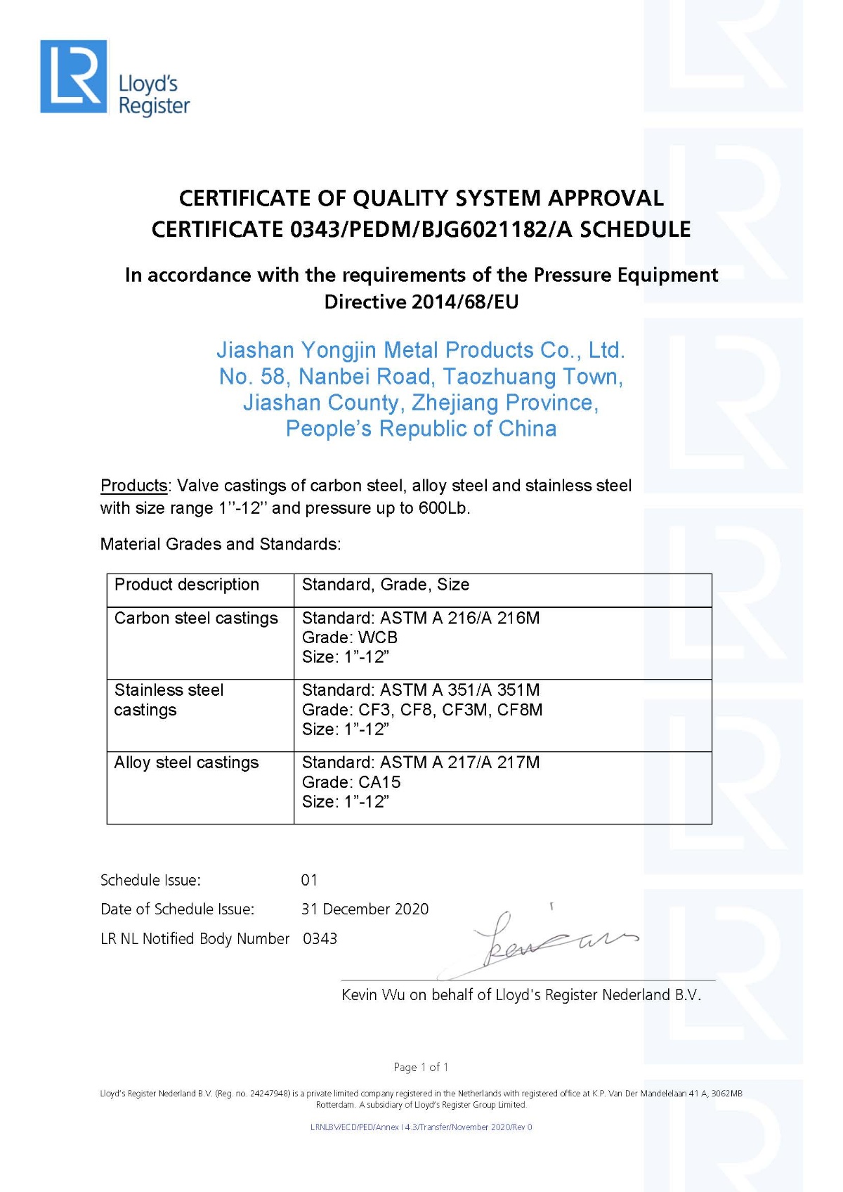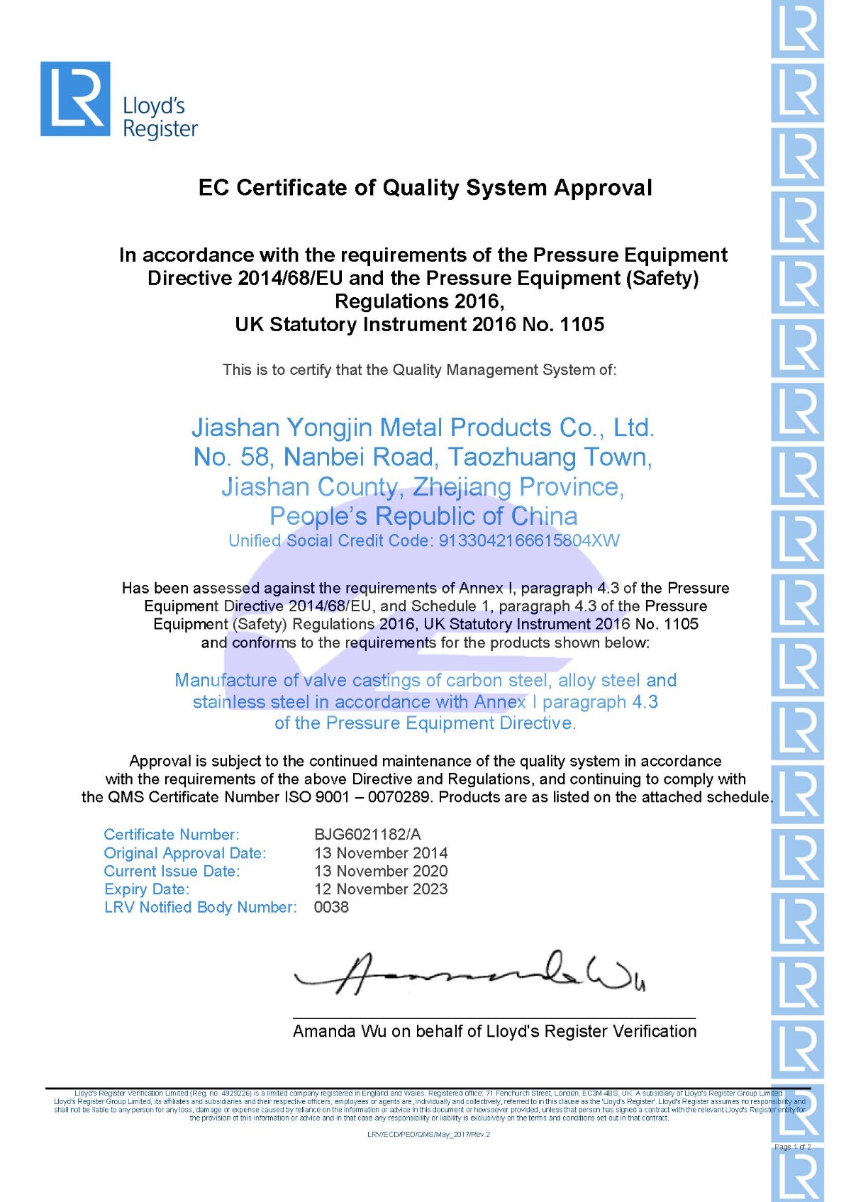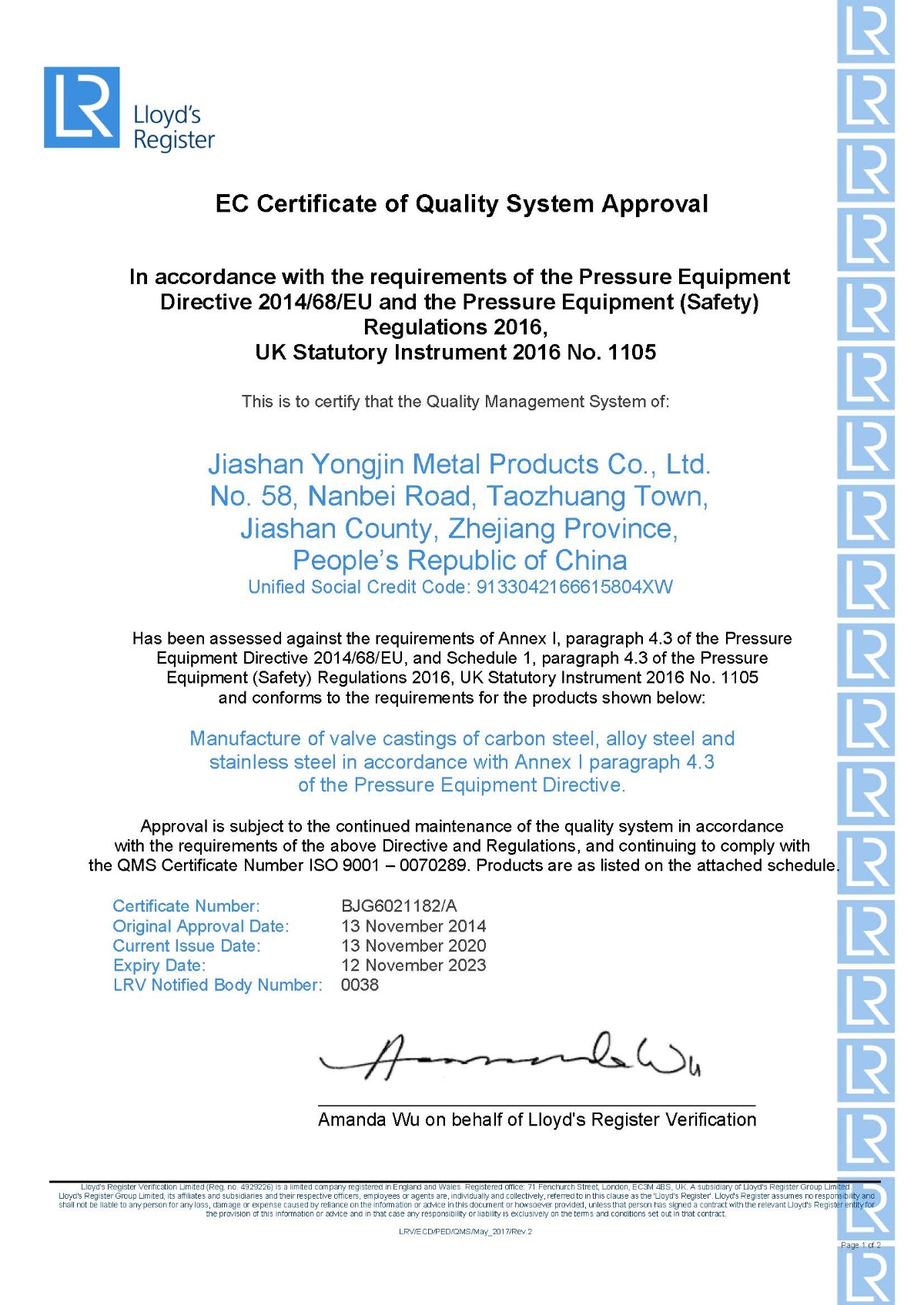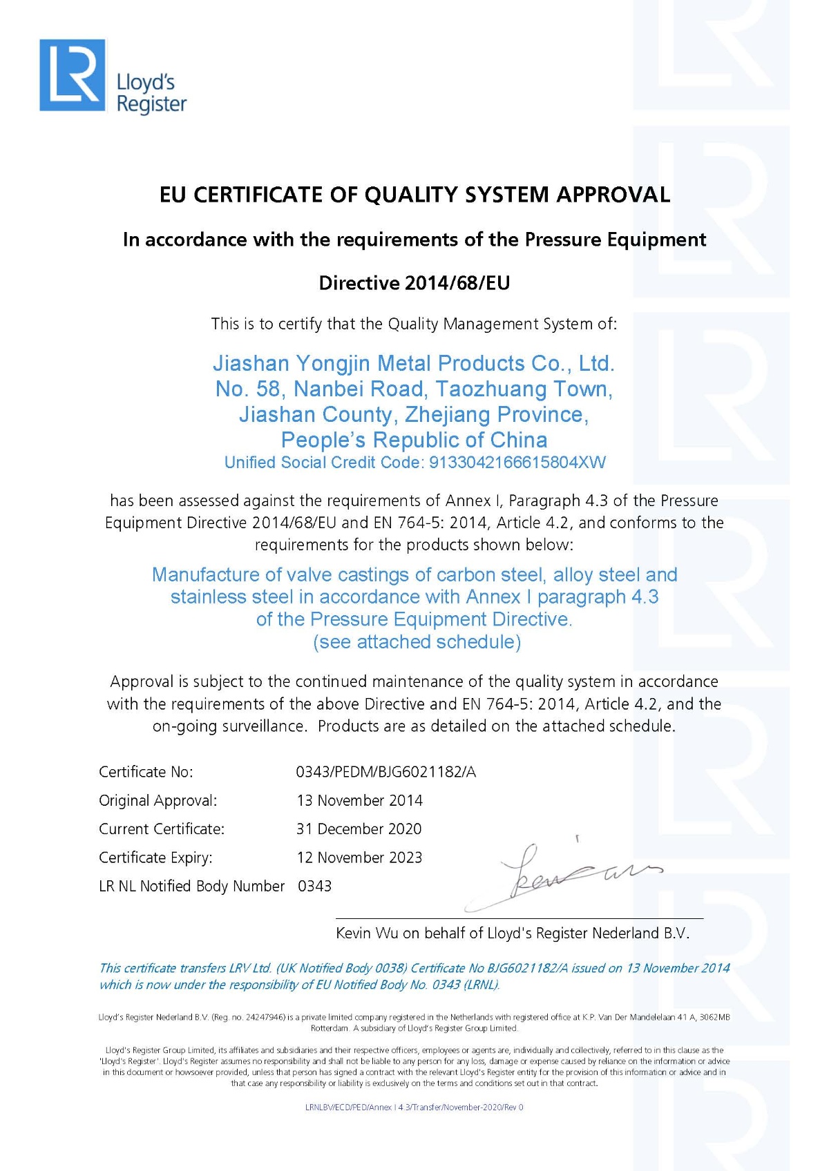 通過歐盟壓力容器指令PED 2014/68/EC Annex I - 4.3認證